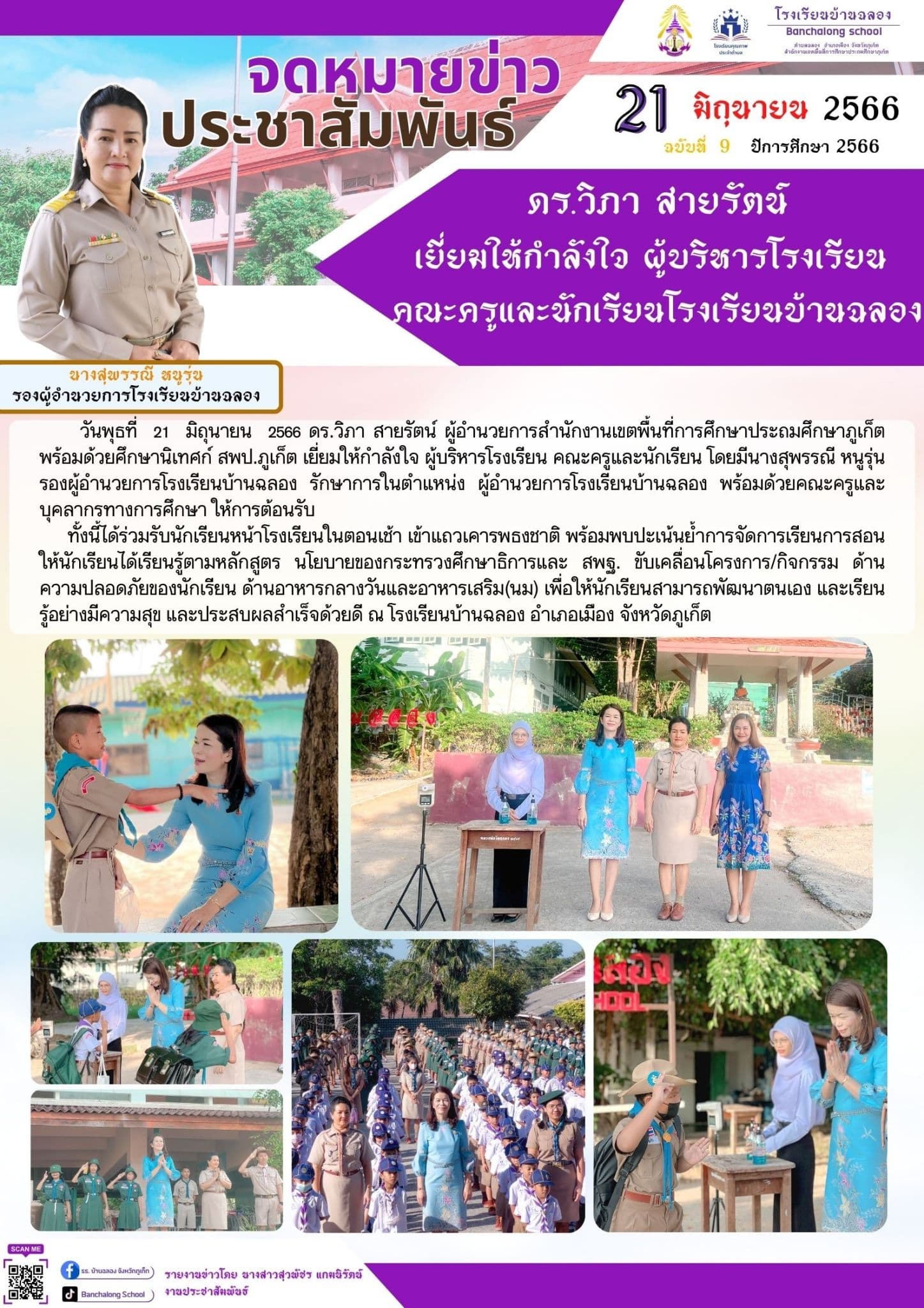 ดร.วิภา สายรัตน์ ผู้อำนวยการสำนักงานเขตพื้นที่การศึกษาประถมศึกษาภูเก็ต พร้อมด้วยศึกษานิเทศก์ สพป.ภูเก็ต เยี่ยมให้กำลังใจ ผู้บริหารโรงเรียน คณะครูและนักเรียน โดยมีนางสุพรรณี หนูรุ่น รองผู้อำนวยการโรงเรียนบ้านฉลอง รักษาการในตำแหน่ง ผู้อำนวยการโรงเรียนบ้านฉลอง พร้อมด้วยคณะครูและบุคลากรทางการศึกษา ให้การต้อนรับ